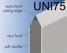 Линейки Universal 75 являются аналогом линеек H75 с единственным отличием, которое заключается в наличии закаленной режущей кромки. Для линеек этого типа характерна высокая тиражестойкость и стабильность. Такими линейками возможно обрабатывать такие материалы как пластик, пластмасса, фольга, линолеум и материалы с абразивными включениями.