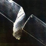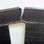 Во-первых, его коническая форма. Такая форма не обеспечивает требуемой жесткости моста. Во-вторых, при простановке никса на линейке на собранной штанцформе велик шанс угодить в место напротив моста в фанере. То есть в самое прослабленное место линейки. Лишнее усилие и все - нож лопнул. В-третьих, если рядом с местом простановки засечки есть стык "под ус", то этот ус деформируется и при высечке на стыке линеек образовывается удерживающая перемычка. В-четвертых, при сильном ударе и если позволяет опорная плита, то нож уходит в основание от общей плоскости ножей (схематически указана пунктиром). Требуется дополнительная приладка или демонтаж формы и выравнивание линеек по высоте. Ниже на фотографиях запечатлены никсы на линейках сделанные шлифмашинкой и зубилом, а также переломленные линейки |